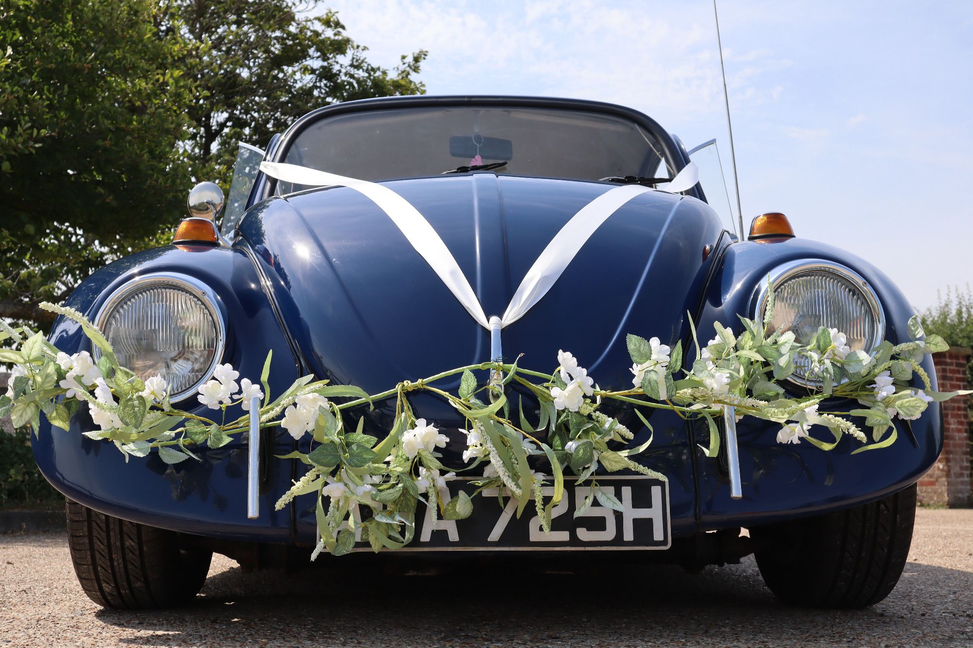our super-cool vintage vw splitscreen bus, sylive comes dressed for your occasion in kent with neutral ribbons, bows and flowers, (and we're obviously more than happy to help you stay on theme with your choice of bonnet ribbon colour instead) when you hire her for your wedding.